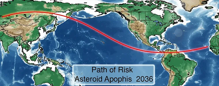 Apophis Path of Risk (PoR); the locus of points on the Earth’s surface where Apophis could impact, if it were to impact the planet on April 13, 2036. Note that the PoR extends almost 270 degrees around the Earth’s surface.