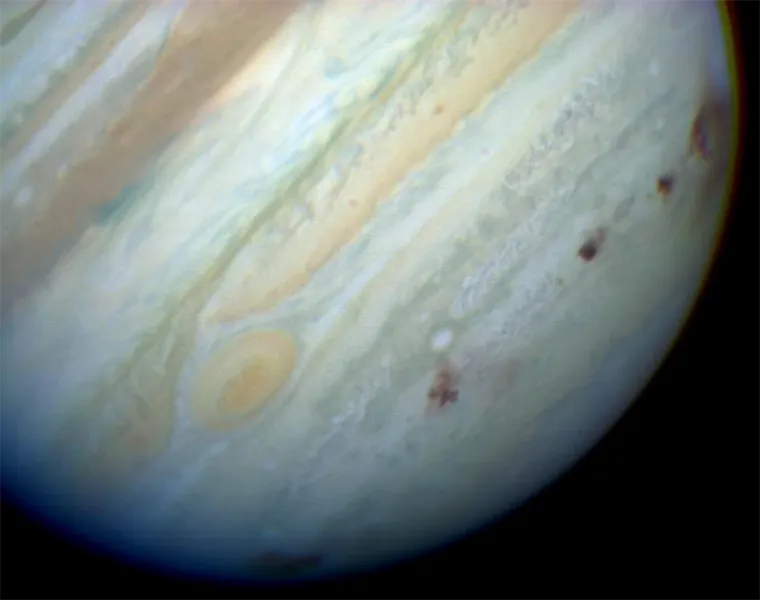Brown spots mark the places where fragments of Comet Shoemaker-Levy 9 tore through Jupiter’s atmosphere in July 1994.