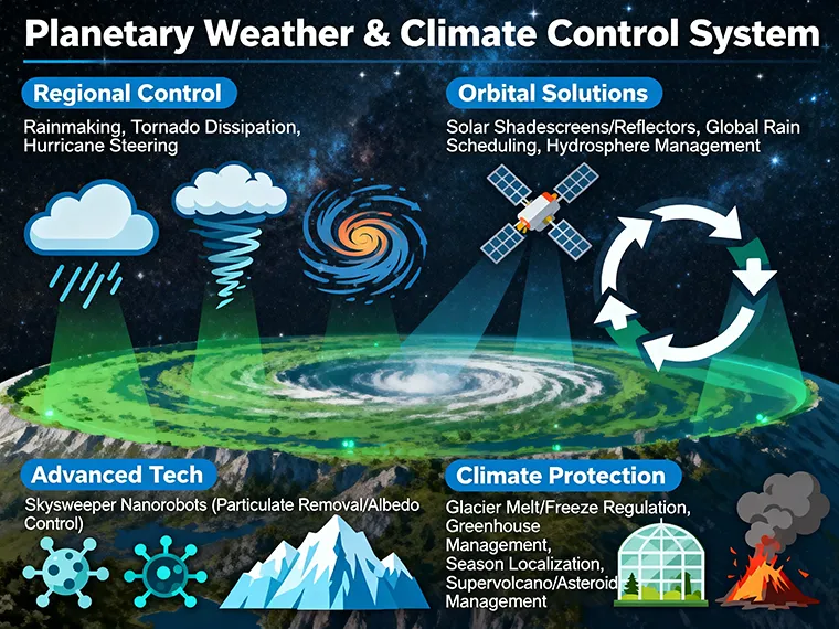 This system would allow control of glacier melt/freeze rates and allow atmospheric greenhouse management, thus completely solving global warming. It would allow us to regulate seasons locally. It would allow us to clean particulates out of the air caused by a supervolcano eruption, a modest asteroid strike, or a nuclear war. Indeed, it would protect our current climate from any sort of sudden change.